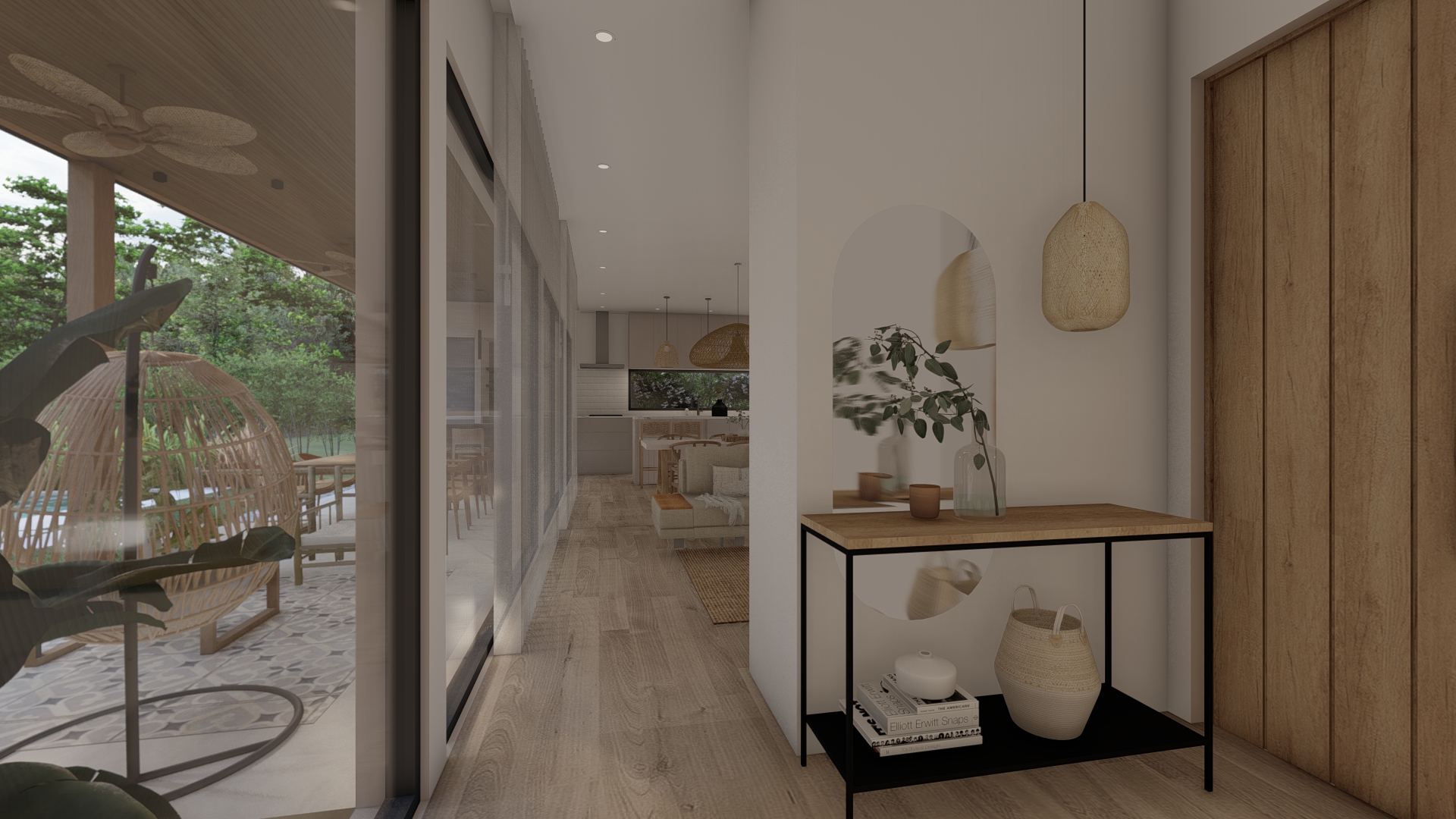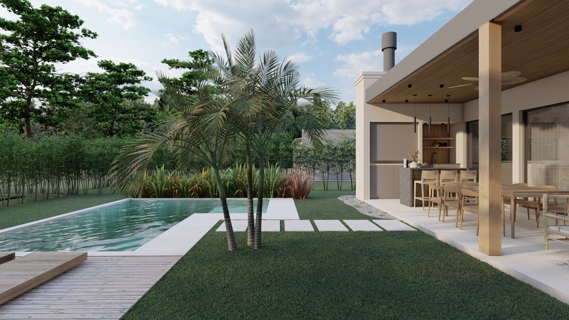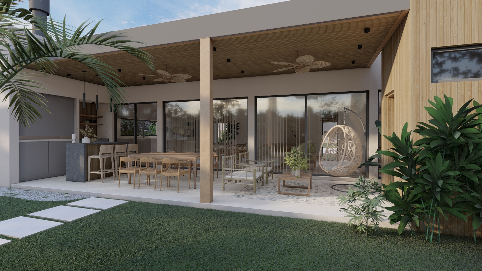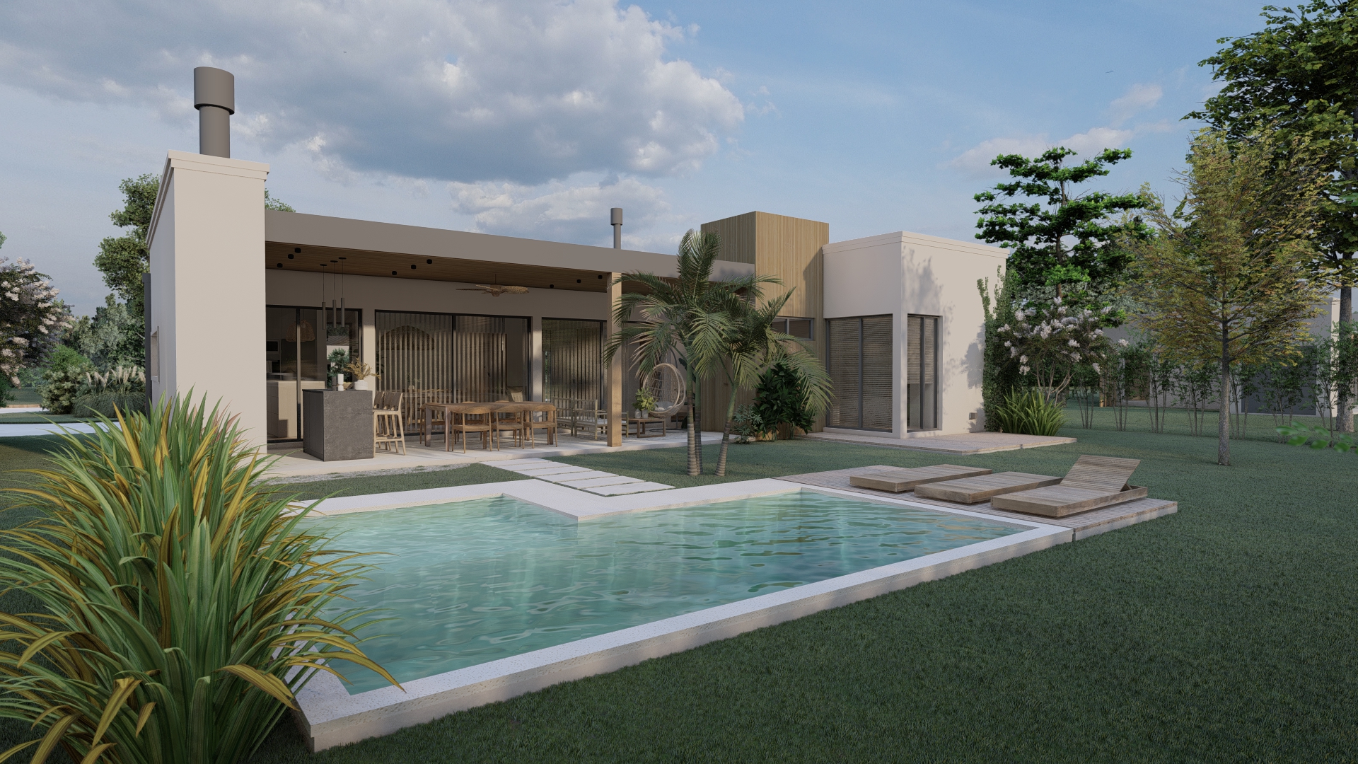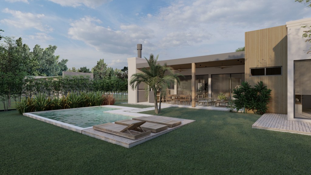 Desde un acceso más contenido, el proyecto se abre progresivamente hacia el exterior, donde la galería y el espacio social se vinculan directamente con el jardín y la piscina.