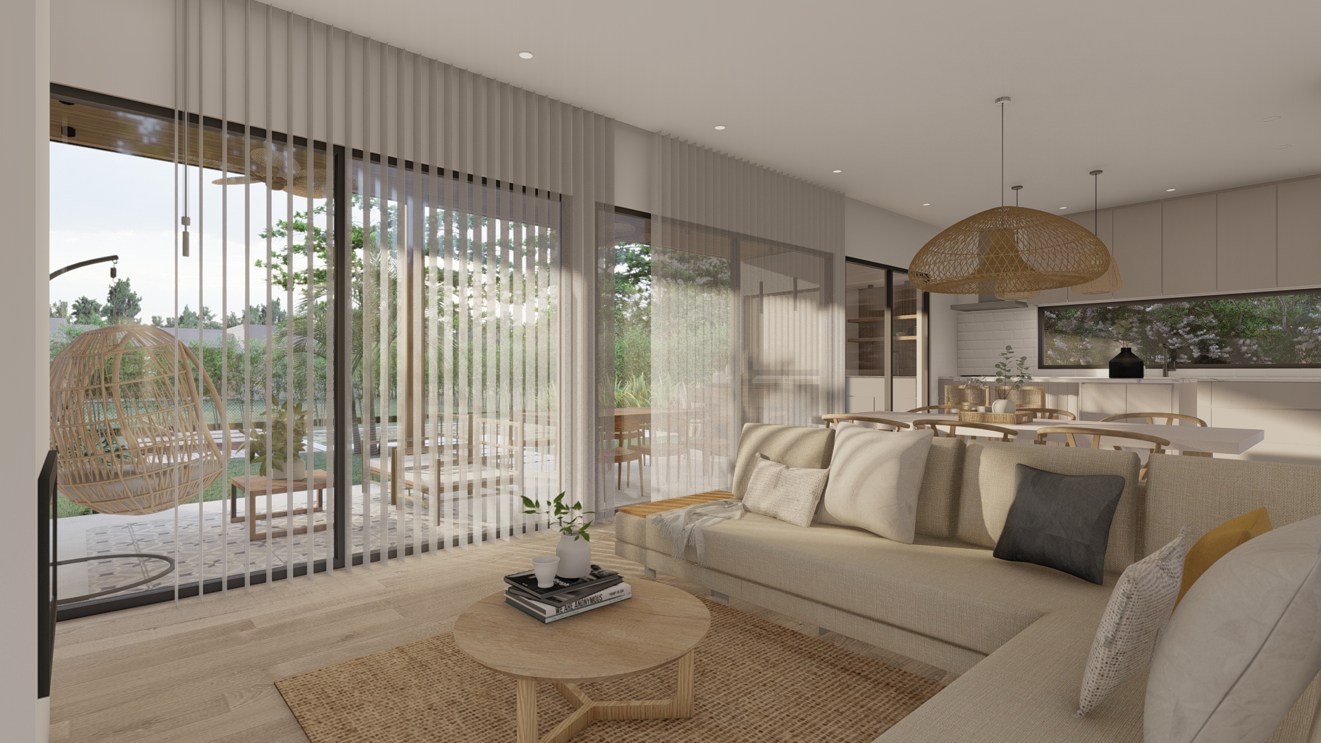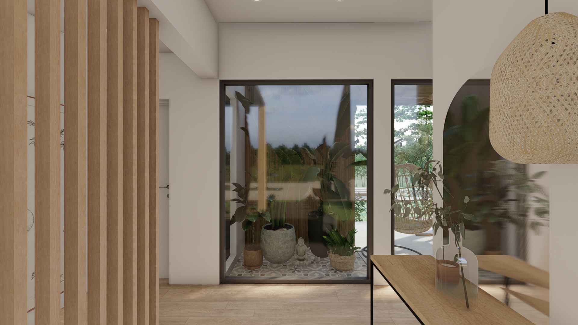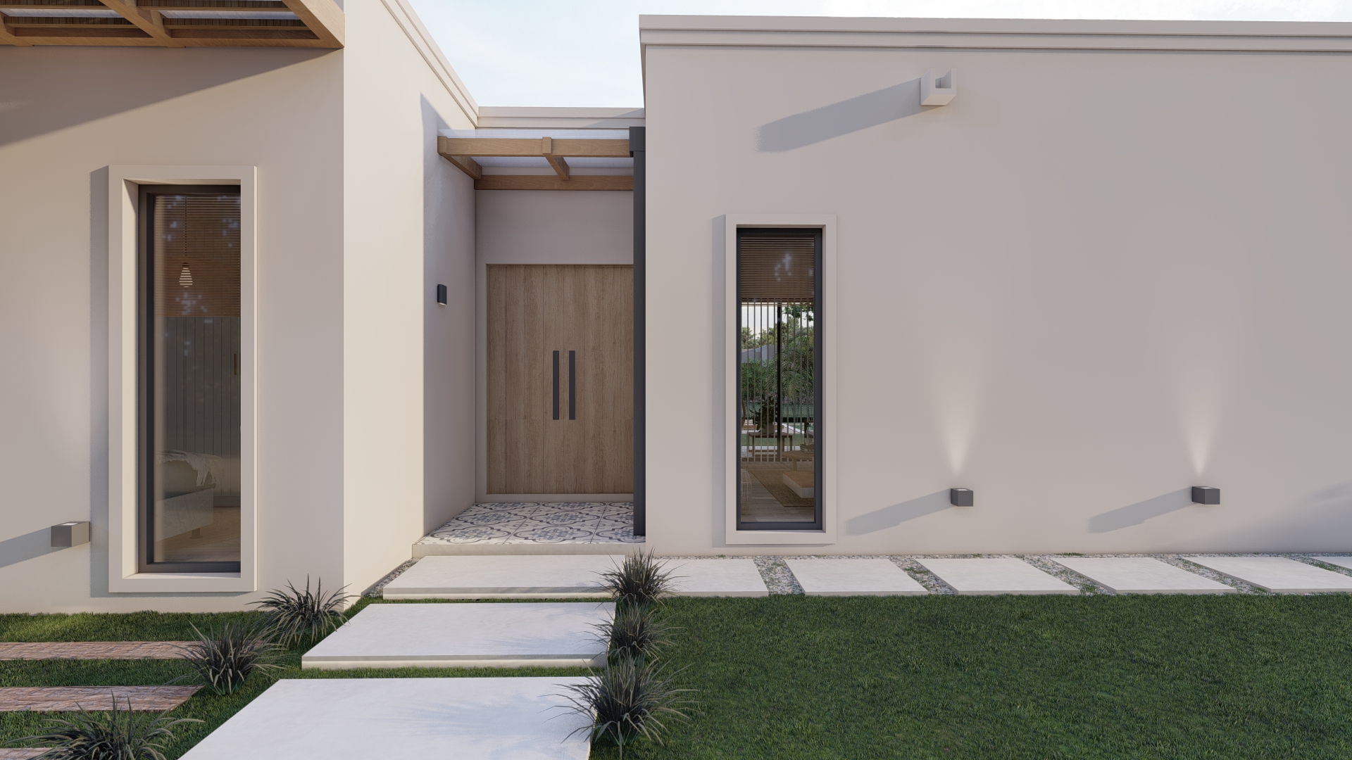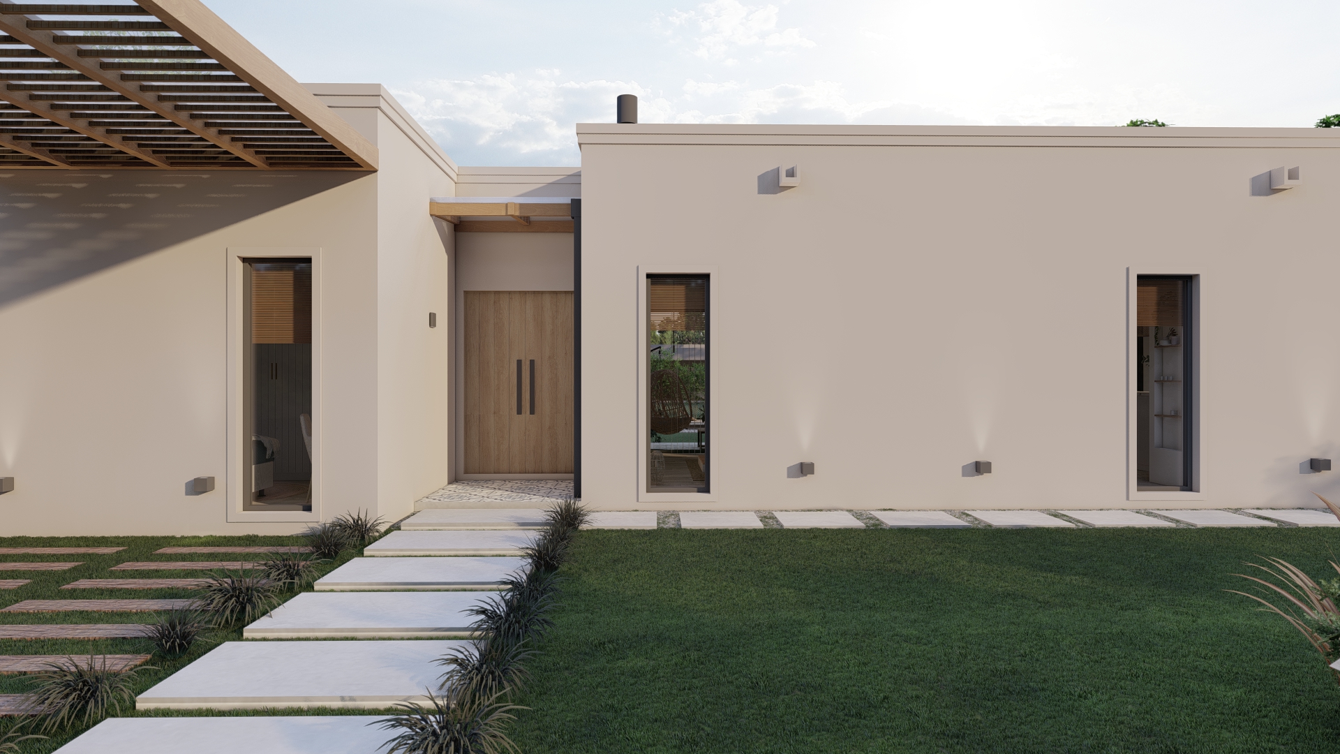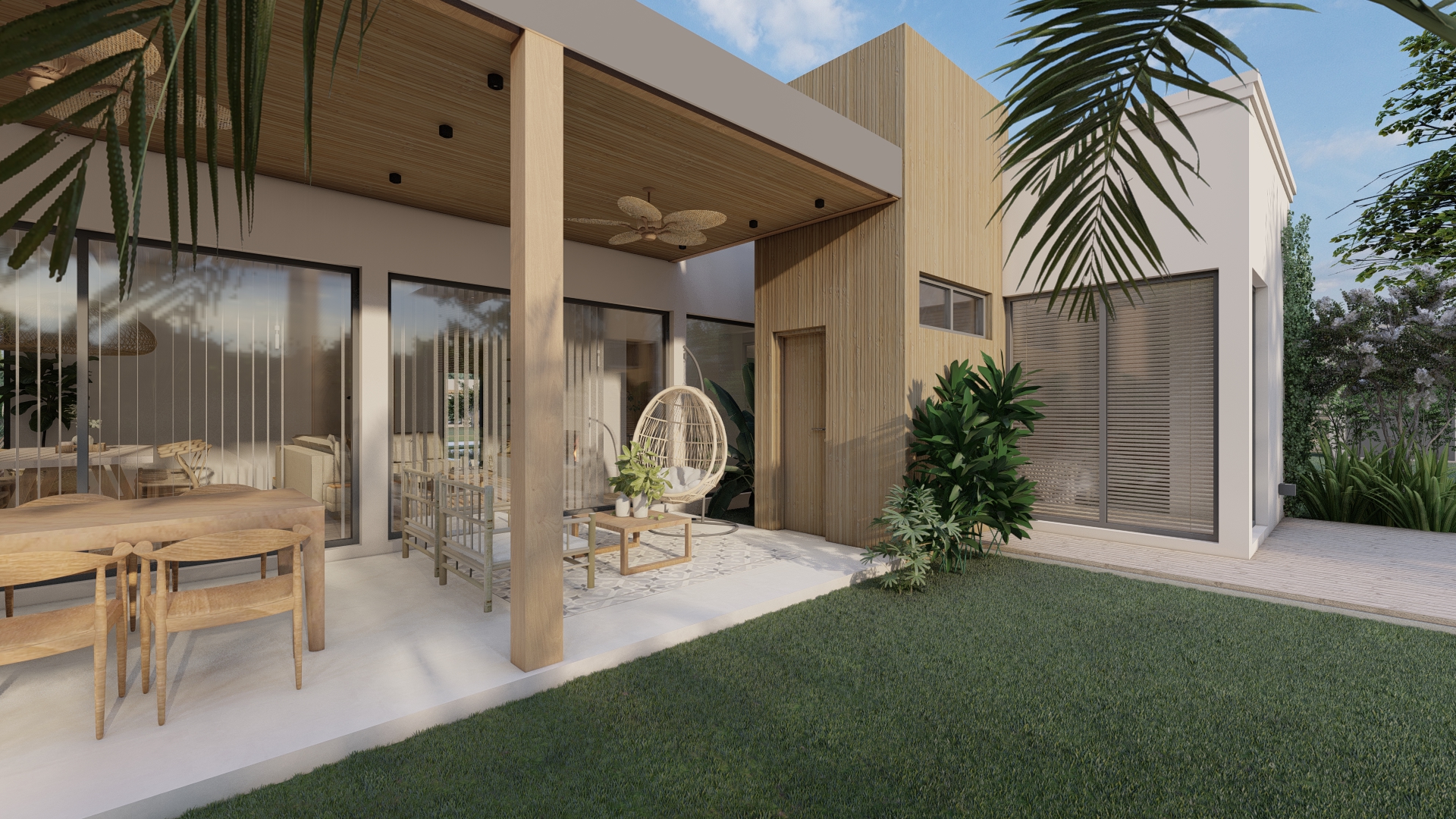 Desde un acceso más contenido, el proyecto se abre progresivamente hacia el exterior, donde la galería y el espacio social se vinculan directamente con el jardín y la piscina.